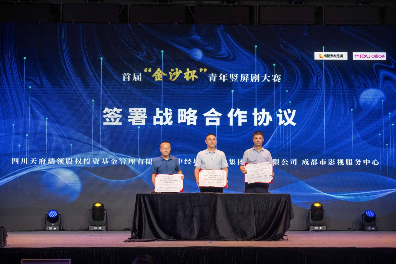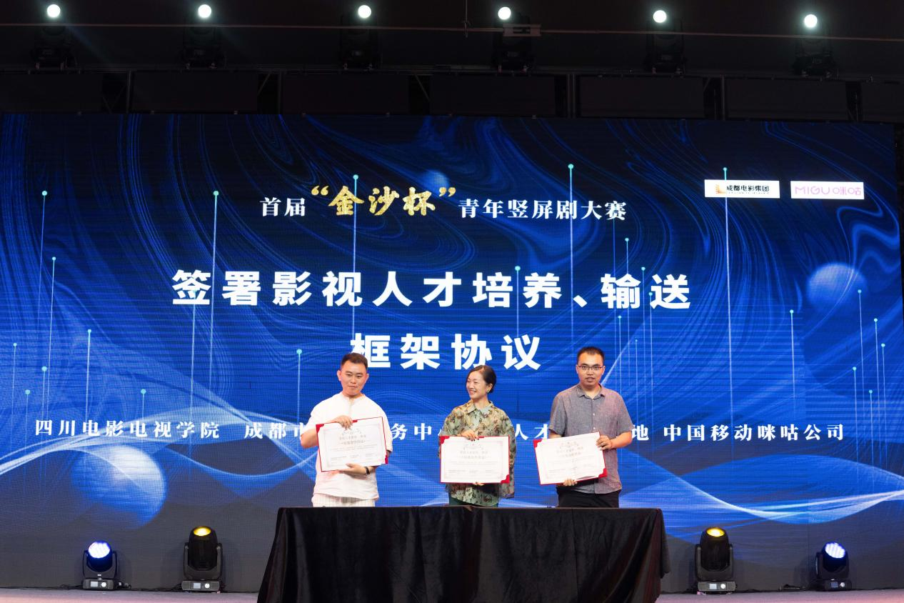 中國移動咪咕公司咕咕工作室短劇制片人黃振民 (左)、四川電影電視學(xué)院黨委副書記、副校長羅思(中)、成都市影視服務(wù)中心人才孵化基地負(fù)責(zé)人張易(右)簽署影視人才培養(yǎng)、輸送框架合作協(xié)議