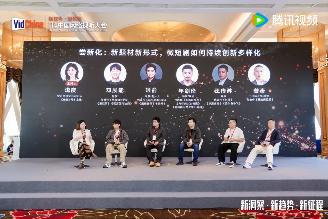 騰訊視頻微短劇一直堅持開拓多元廣闊的題材,做品類創(chuàng)新的領跑者。在圓桌討論環(huán)節(jié)二,資深文藝評論人、《傳媒1號》主編淺度作為主持人,以“新題材新形式,微短劇如何持續(xù)創(chuàng)新多樣化”為主題與五位導演展開討論,都市微短劇《結婚嗎好的》導演鄧展能、文物保護題材微短劇《趙小姐的日記》導演姬俞、無限流題材微短劇《與你的九次相遇》導演年劍倫、互動微短劇《師傅》導演王傳淋和文旅題材微短劇《重慶遇見愛》導演曾奇,分別聚焦于新題材探索、游戲體驗再現(xiàn)、文旅賦能等話題分享自身的創(chuàng)新思路,展示了微短劇行業(yè)的新鮮活力與發(fā)展趨勢。