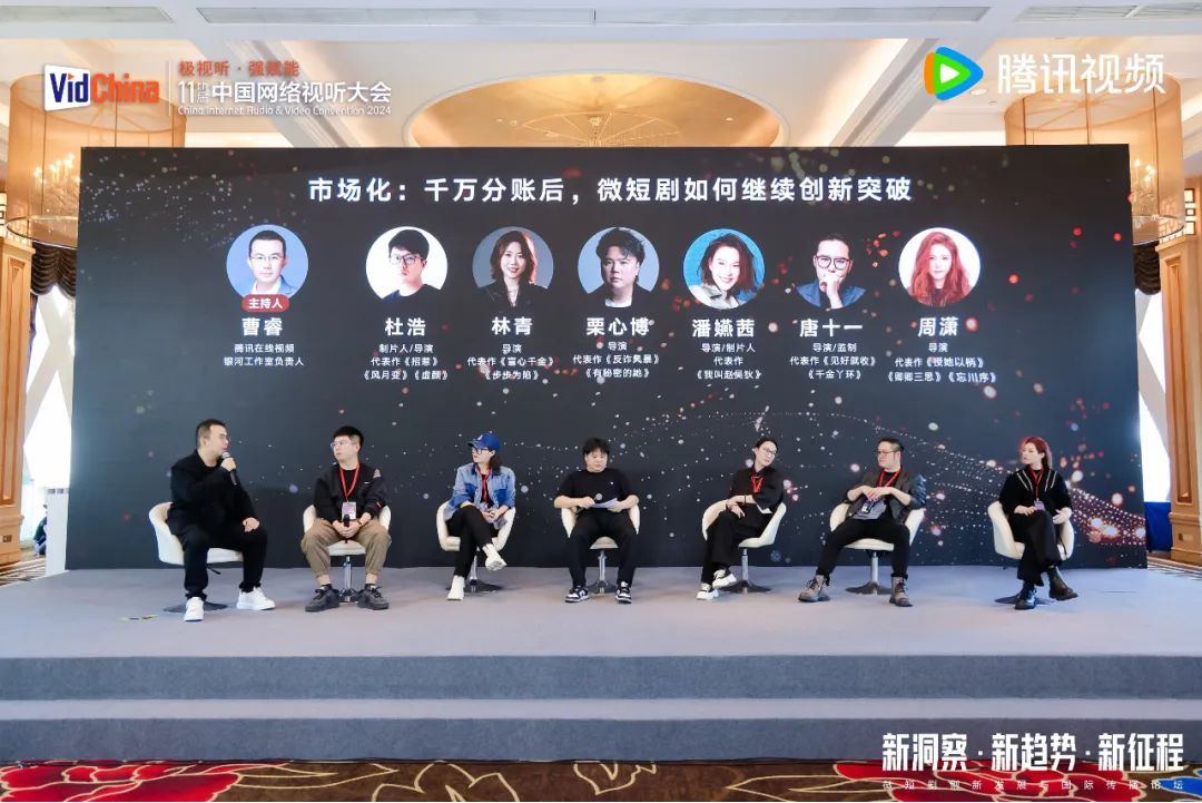 在精品化創(chuàng)制、多元類型布局的思路指引下,一批熱度與口碑兼具的微短劇涌現(xiàn)市場。在第一個圓桌對話環(huán)節(jié),騰訊在線視頻銀河工作室負責人曹睿作為主持人,與六位導演:《招惹》總制片人杜浩、《反詐風暴》導演栗心博、《盲心千金》導演林青、《我叫趙吳狄》導演潘嬿茜、《見好就收》導演唐十一、《授她以柄》導演周瀟,共議“千萬分賬后微短劇如何繼續(xù)創(chuàng)新突破”。幾位嘉賓以“求新”為關鍵詞,分別分享自身在微短劇創(chuàng)作上關于新題材、新內容、新情緒、新呈現(xiàn)的創(chuàng)新思路,并提出“以‘小體量’追求‘大格局’”、“情緒是最佳原動力”等創(chuàng)作理念。